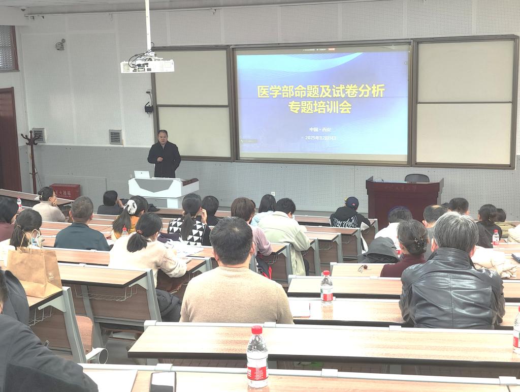 12月5日,为深化教育教学评价改革,提升教师命题质量与试卷分析能力,暨前瞻筹划2026年中国医学教育题库命题创新大赛,医学部人才培养处举办了命题及试卷分析专题培训会。会议围绕命题原则规范、技术方法与试卷分析等内容展开系统培训与交流,来自医学部各院系的学科负责人、命题教师、教务管理人员及相关教学人员参加。