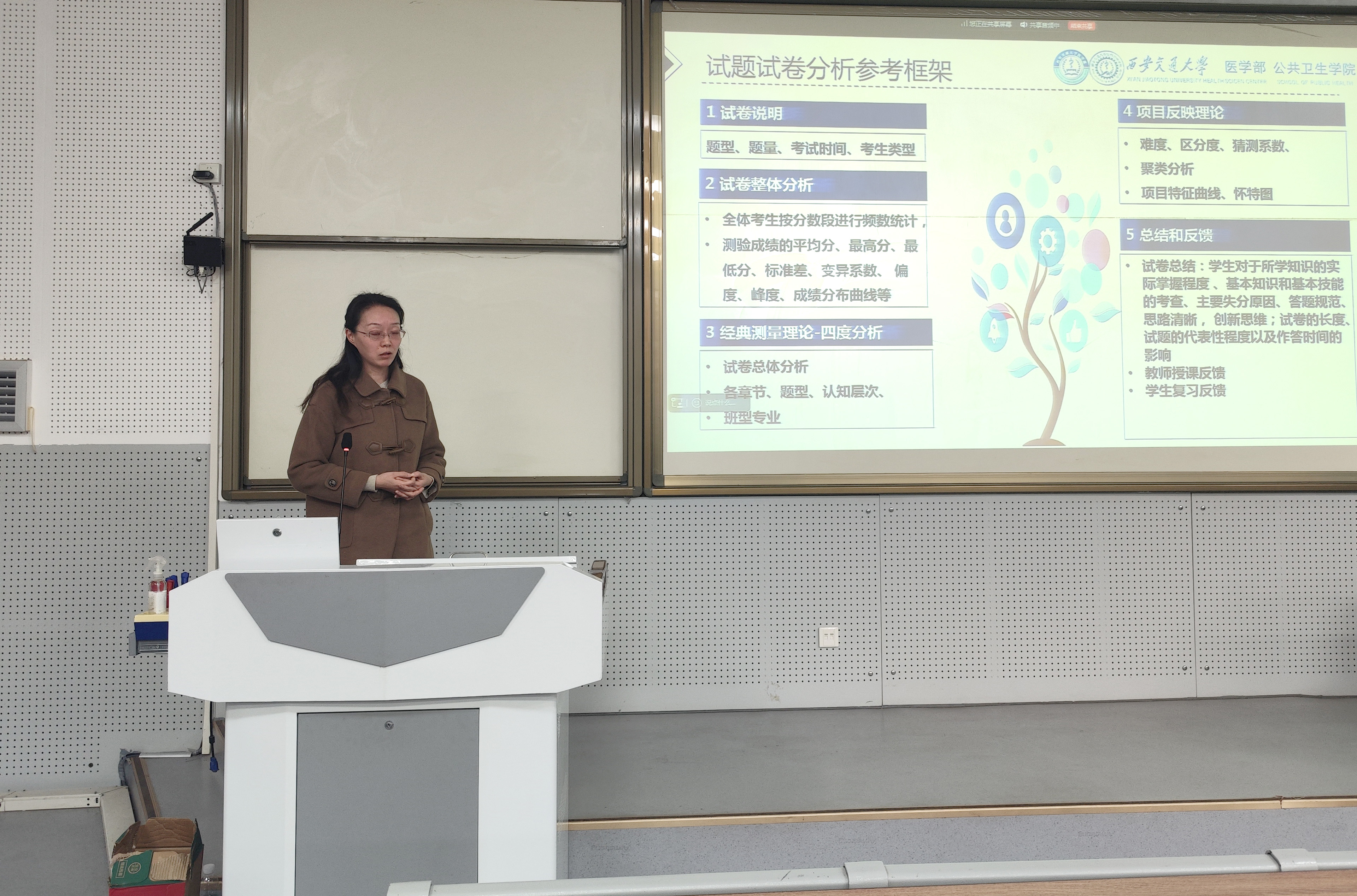 会议邀请第一附属医院的李雪兰教授系统阐述了命题的基本原则、医学考试题型格式、不同题型的命题要求、常见问题及注意事项;邀请公共卫生学院的申远教授从教育测量学的角度阐述和解读了经典的测量理论、项目反应理论,并聚焦试题特征曲线运用大量详实的图本示例,讲解了如何通过试卷分析数据深度诊断学生学习情况,实现“以评促教、以评促学”。