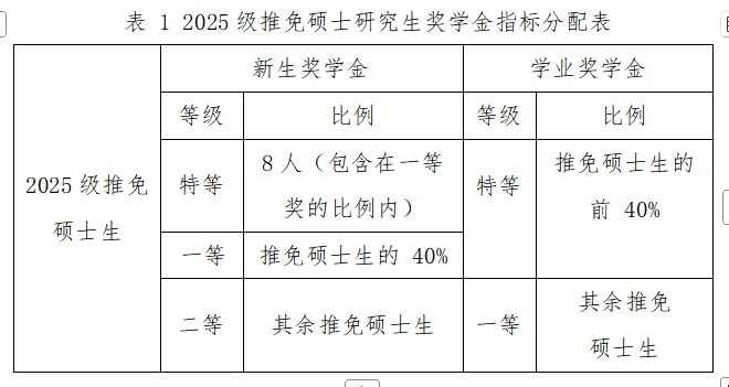 获得 2025年新生奖学金特等奖和一等奖的推免硕士生自动获得学业奖学金特等奖,获得新生奖学金二等奖的推免硕士生自动获得学业奖学金一等奖(详见表 1)。