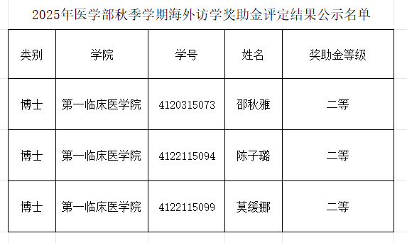 根据研究生院《西安交通大学研究生海外访学奖助金管理暂行办法》(西交研〔2018〕255号)、《西安交通大学医学部研究生海外访学奖助金评审实施细则(试行)》(西交医人培〔2018〕10号),以及医学部2025年秋季学期研究生海外访学奖助金相关工作安排的通知,经医学部奖助金评审委员会审核,现将医学部2025年秋季学期研究生海外访学奖助金评定结果公示如下: